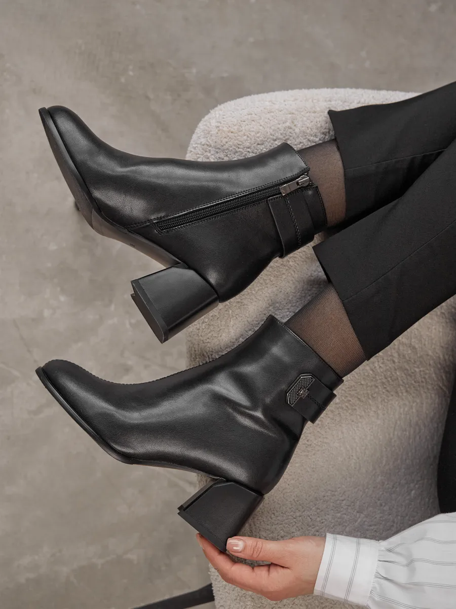 Практичные и трендовые, ботильоны станут незаменимыми в гардеробе для офиса, поездок, прогулок и даже вождения автомобиля. Их низкий каблук подчёркивает стройность ног, а классический черный цвет и дизайн делают их универсальным акцентом в любом образе. Независимо от вашего стиля, эта модель ботильонов станет идеальным выбором для создания элегантных и комфортных луков на каждый день.
