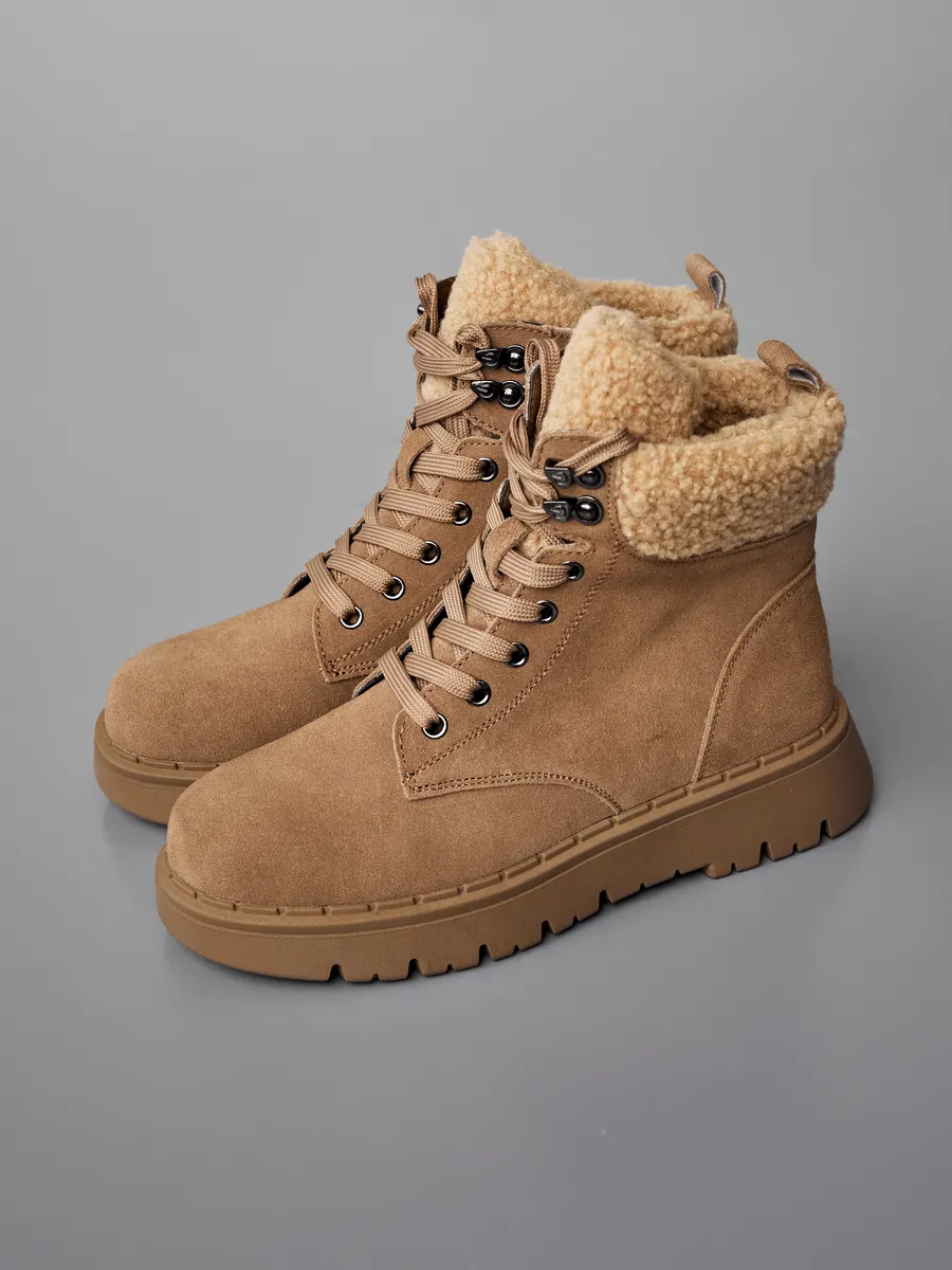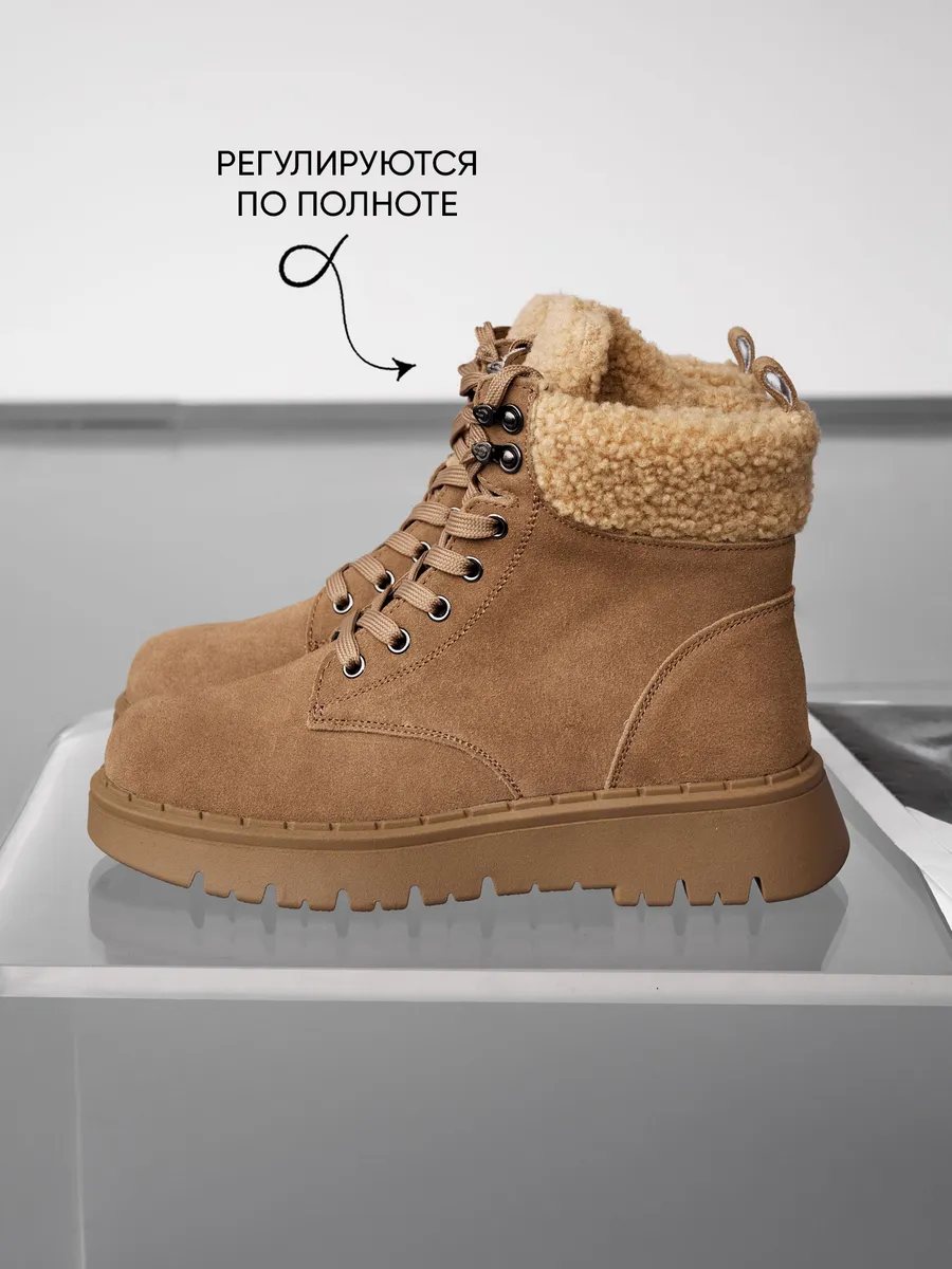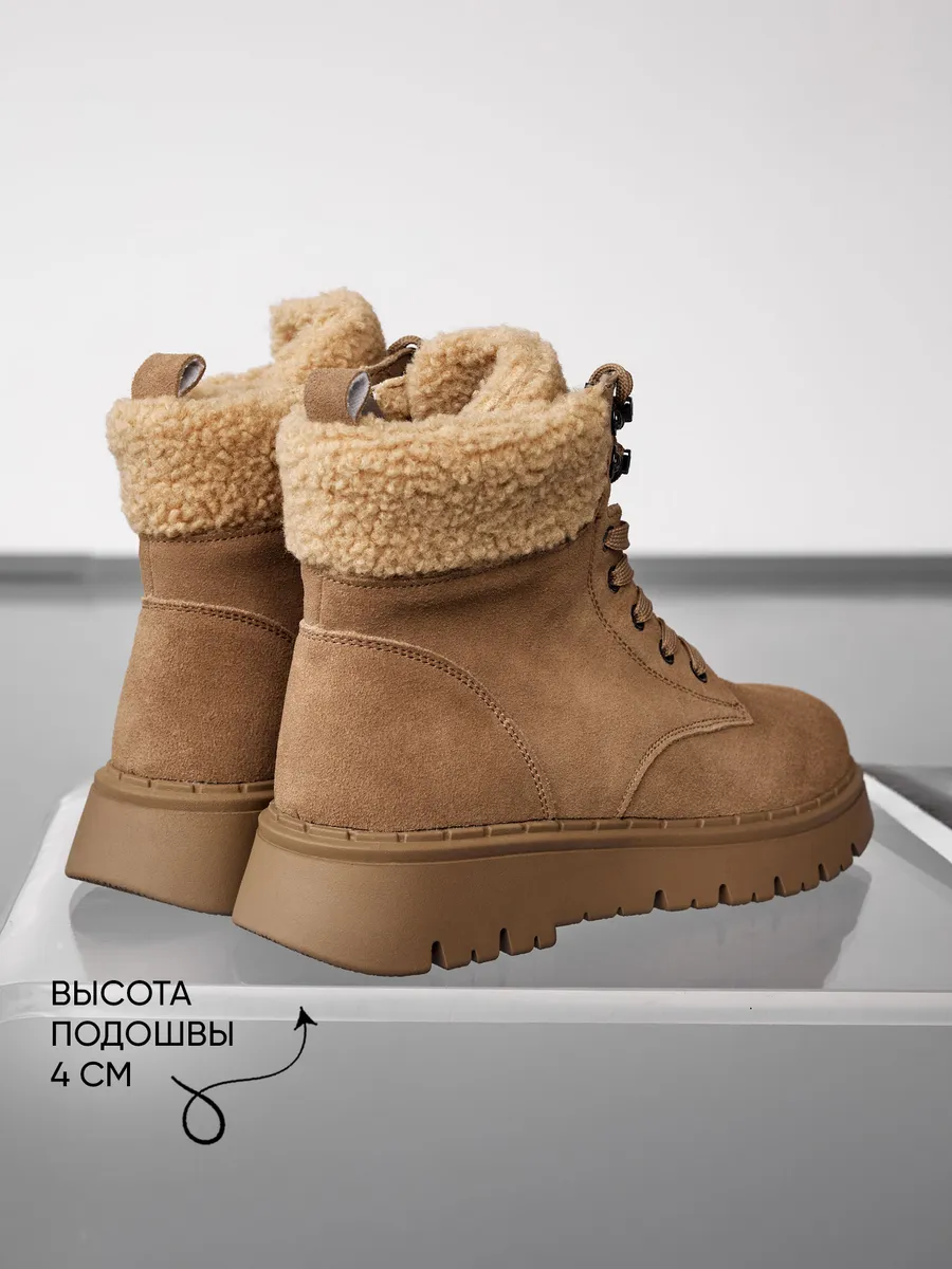Эти бежевые зимние ботинки на платформе обеспечат отличную устойчивость на скользких поверхностях. Натуральная съемная шерстяная стелька обеспечит тепло и комфорт ваших ног в холодный сезон. Высококачественные материалы гарантируют долговечность, устойчивы к истиранию и идеально подходят для зимнего периода.