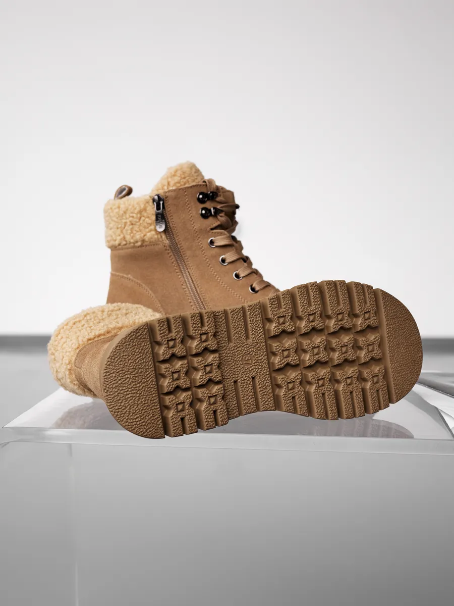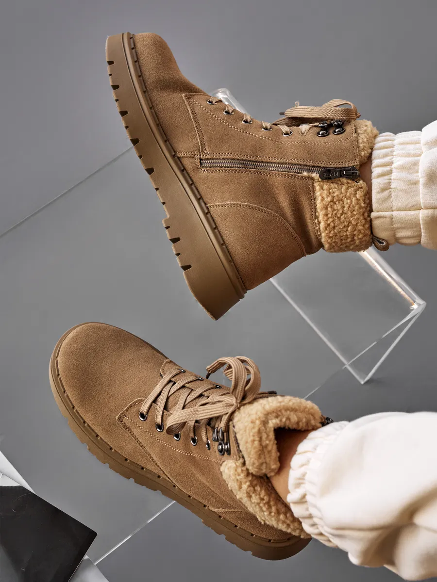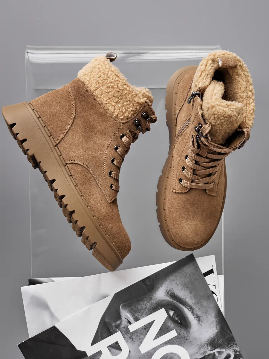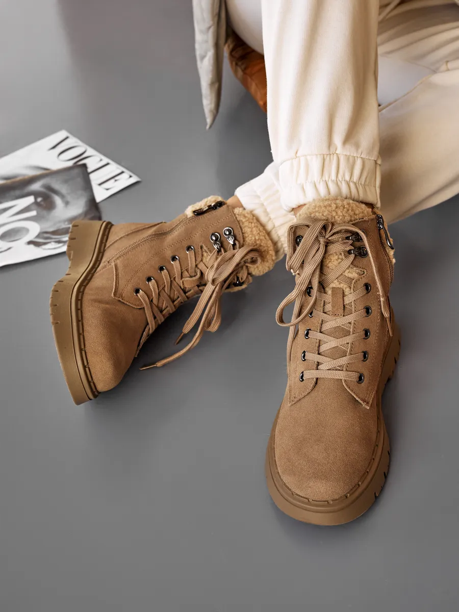 Эти бежевые зимние ботинки на платформе обеспечат отличную устойчивость на скользких поверхностях. Натуральная съемная шерстяная стелька обеспечит тепло и комфорт ваших ног в холодный сезон. Высококачественные материалы гарантируют долговечность, устойчивы к истиранию и идеально подходят для зимнего периода.