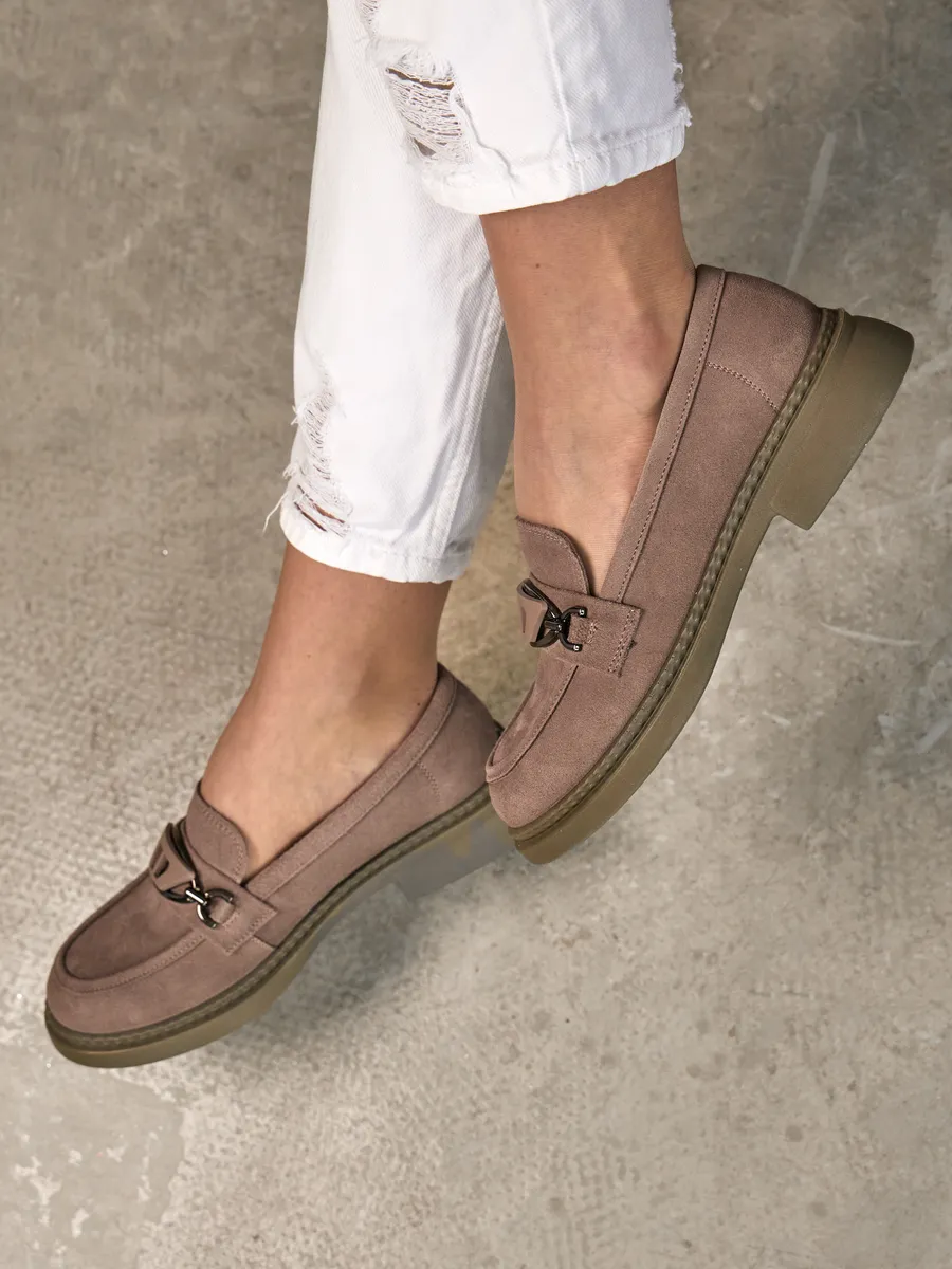 Наши лоферы выполнены из высококачественной натуральной замши, что обеспечивает долговечность и стильный внешний вид. Модная и классическая модель представлена в интересном розовом цвете с серым отливом на низком каблуке и платформе. Стелька с ортопедическим эффектом и удобная подошва гарантируют максимальный комфорт при ходьбе, даже на протяжении длительного времени.