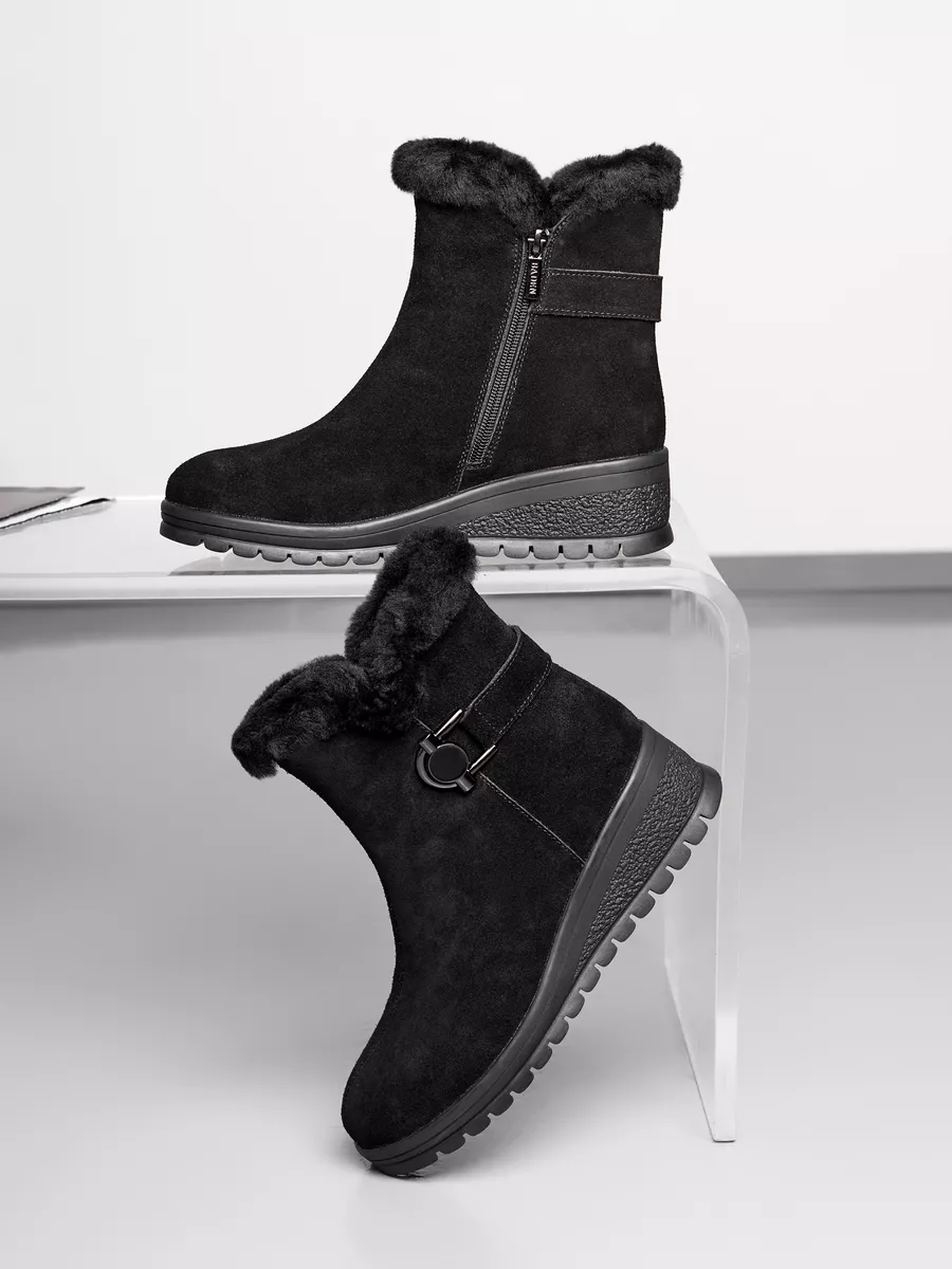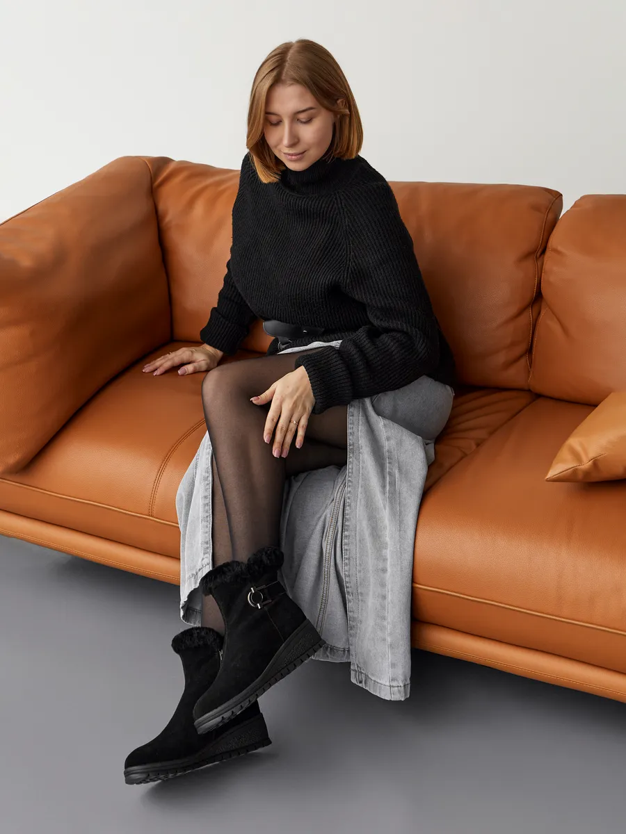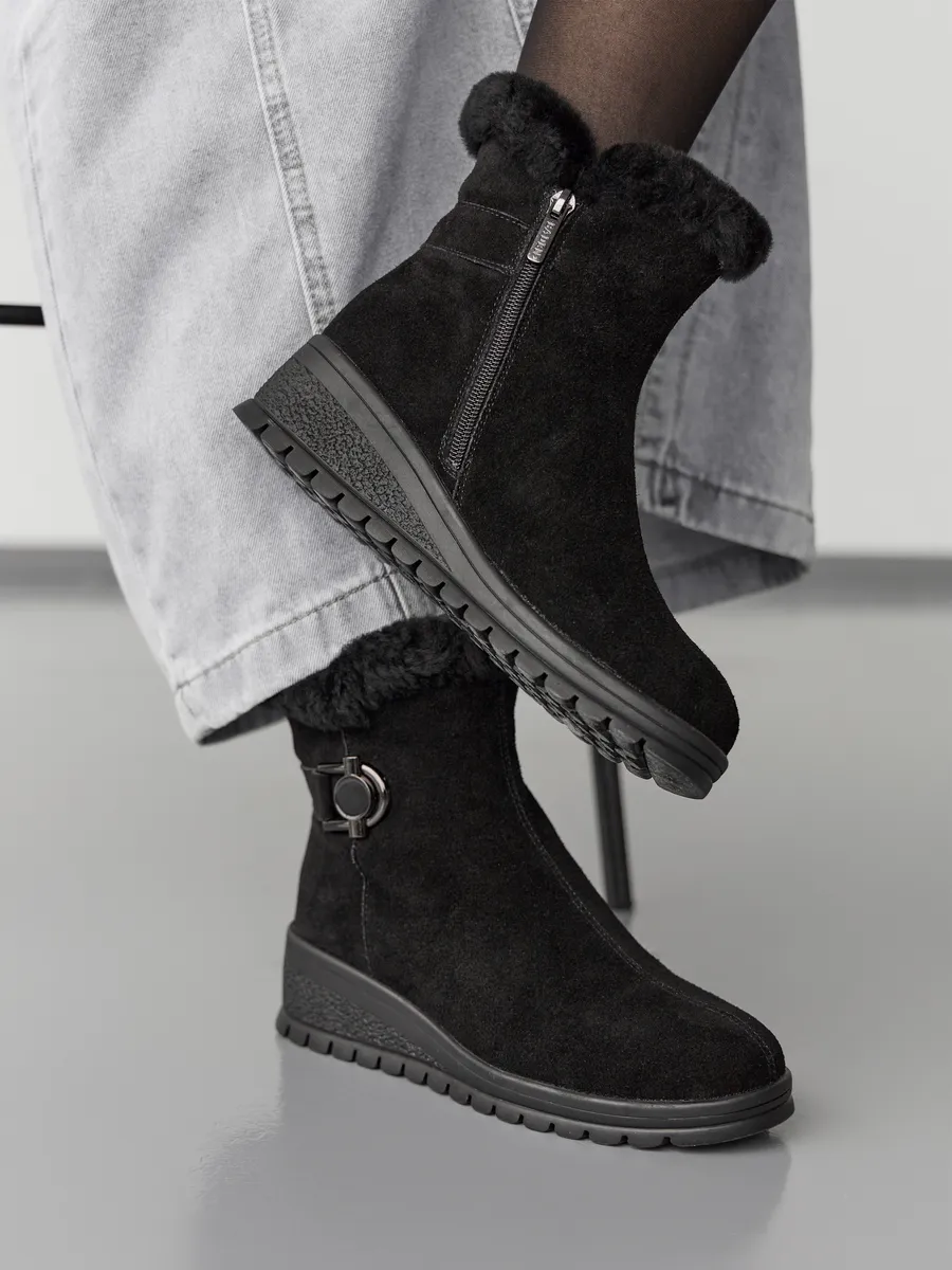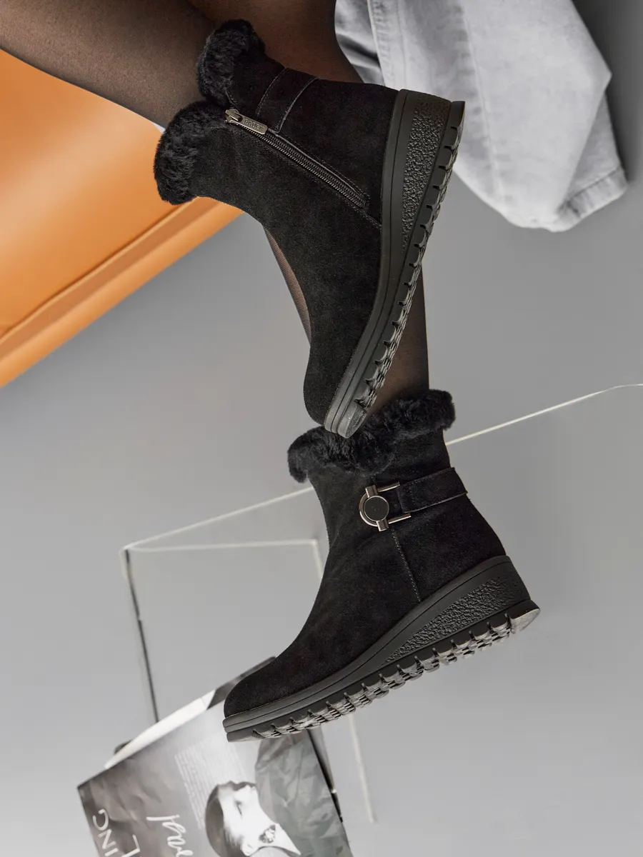 Классические черные замшевые полусапоги с меховой опушкой подходят не только для повседневного ношения, но и для более торжественных случаев. Платформа средней высоты и танкетка обеспечивает комфорт и устойчивость, что делает эту обувь идеальной для активного дня. Непромокаемые материалы и утепленная подкладка из шерсти делают сапоги практичными и надежными для зимних условий.