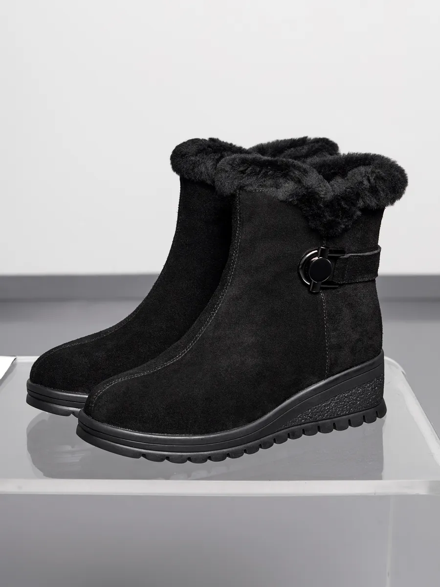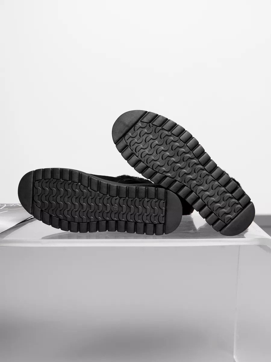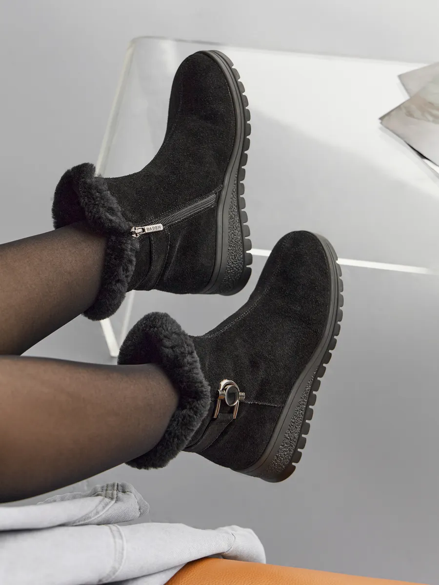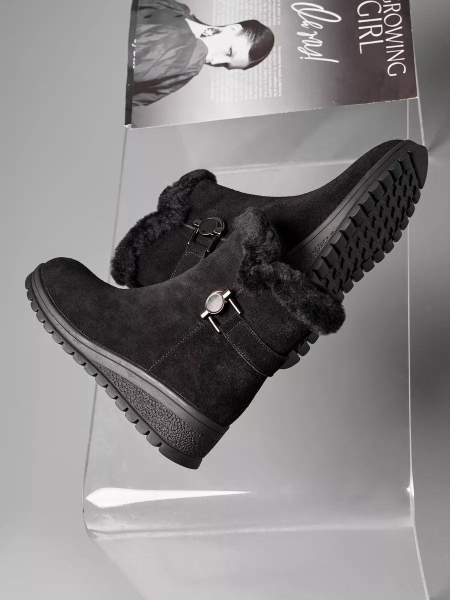 Классические черные замшевые полусапоги с меховой опушкой подходят не только для повседневного ношения, но и для более торжественных случаев. Платформа средней высоты и танкетка обеспечивает комфорт и устойчивость, что делает эту обувь идеальной для активного дня. Непромокаемые материалы и утепленная подкладка из шерсти делают сапоги практичными и надежными для зимних условий.