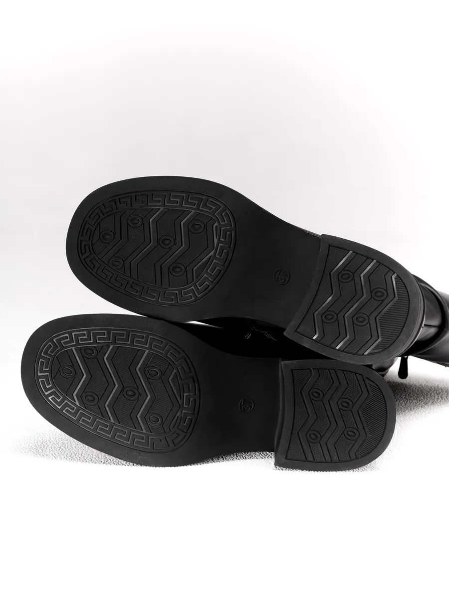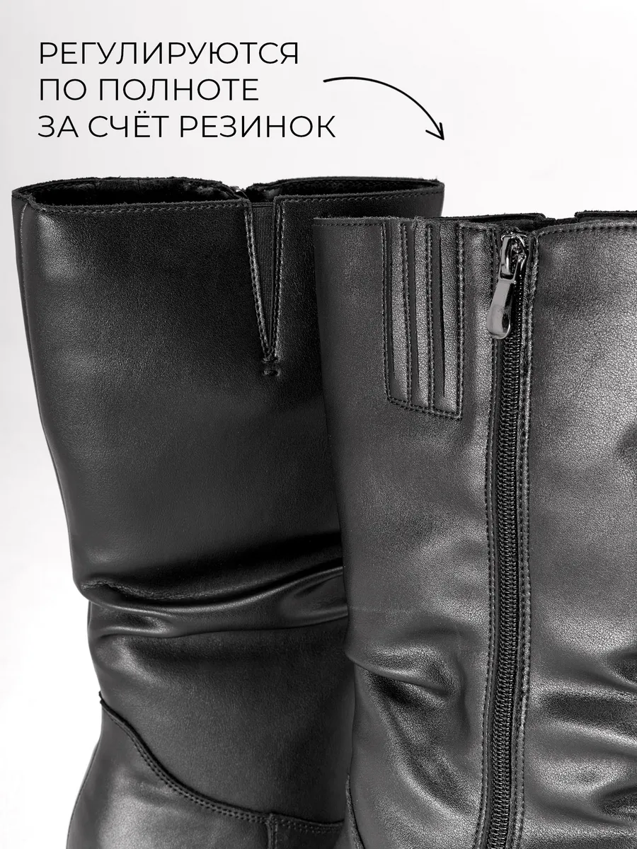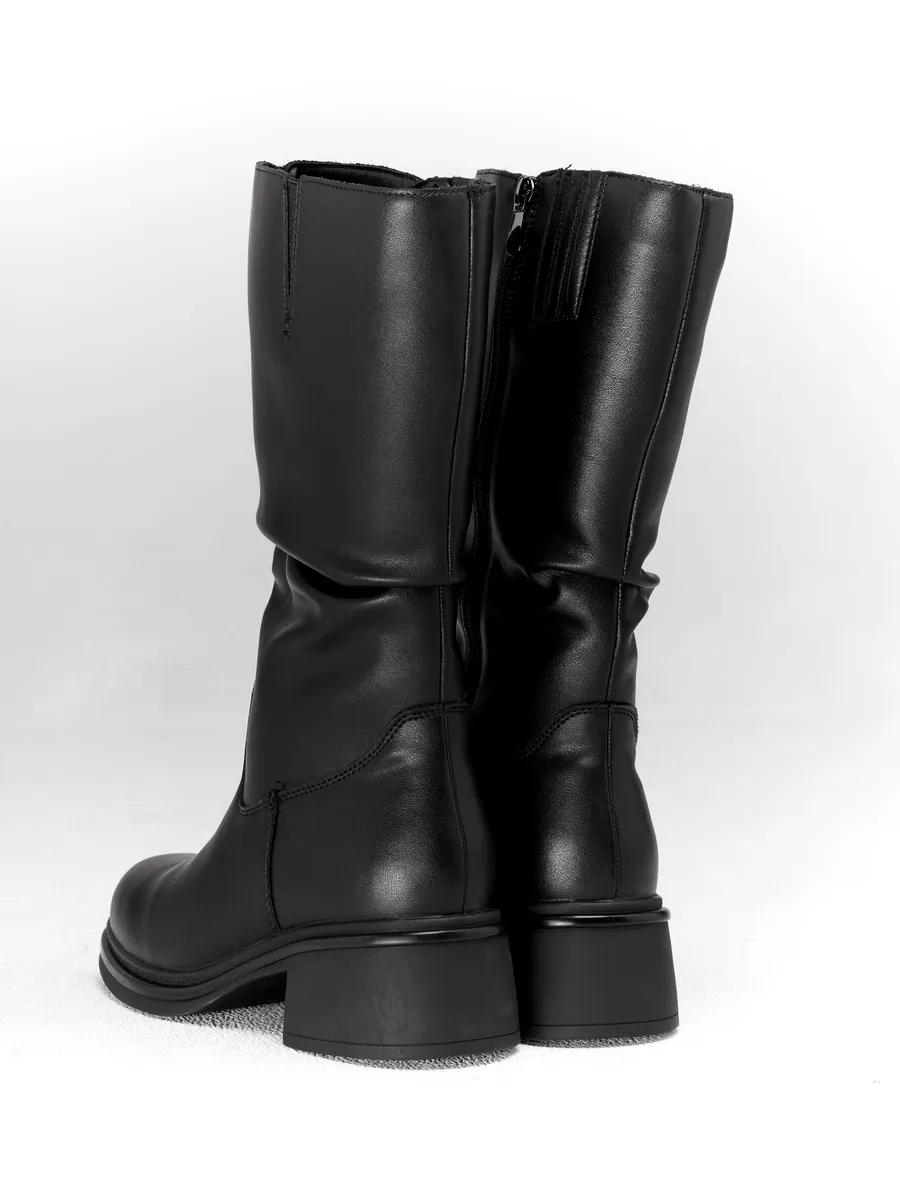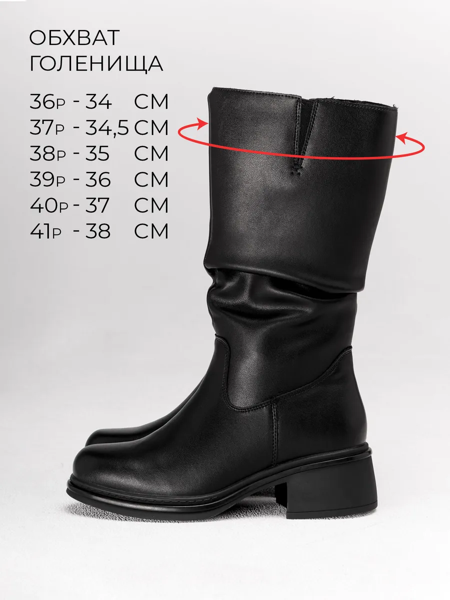 Удобный низкий каблук позволят ощущать себя более устойчиво на скользкой поверхности в зимний период. Классические сапоги черного цвета подойдут к любому наряду, делая Ваш образ неповторимым. Эти сапоги - тренд 2025 года.