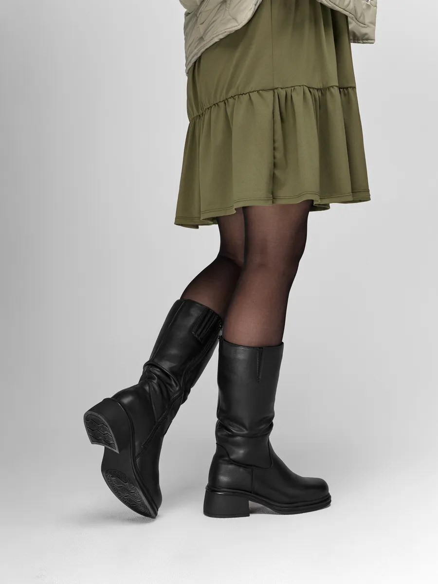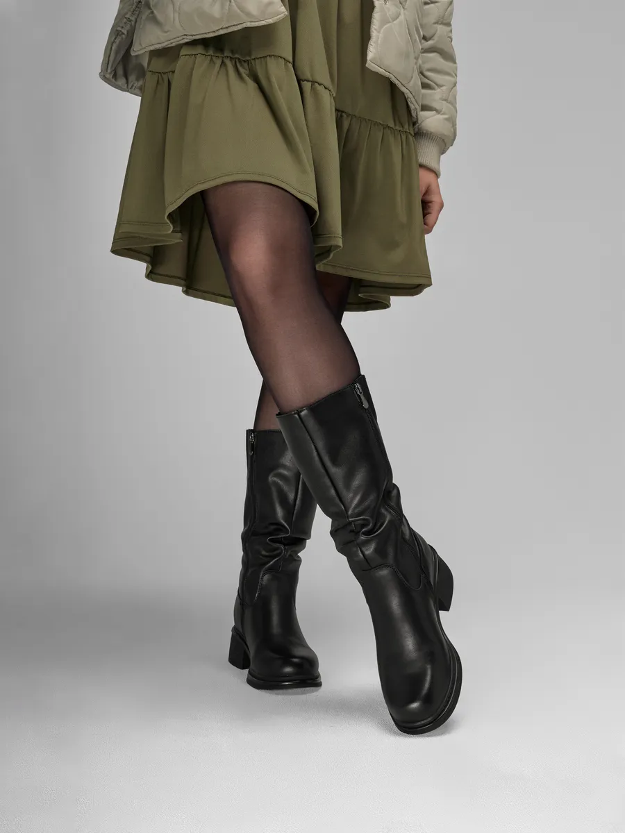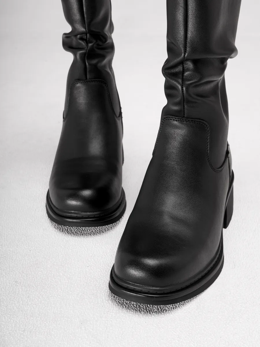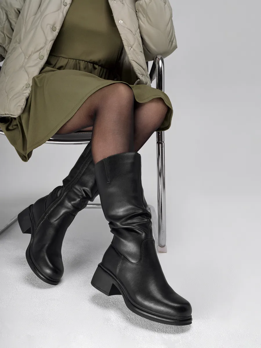 Удобный низкий каблук позволят ощущать себя более устойчиво на скользкой поверхности в зимний период. Классические сапоги черного цвета подойдут к любому наряду, делая Ваш образ неповторимым. Эти сапоги - тренд 2025 года.