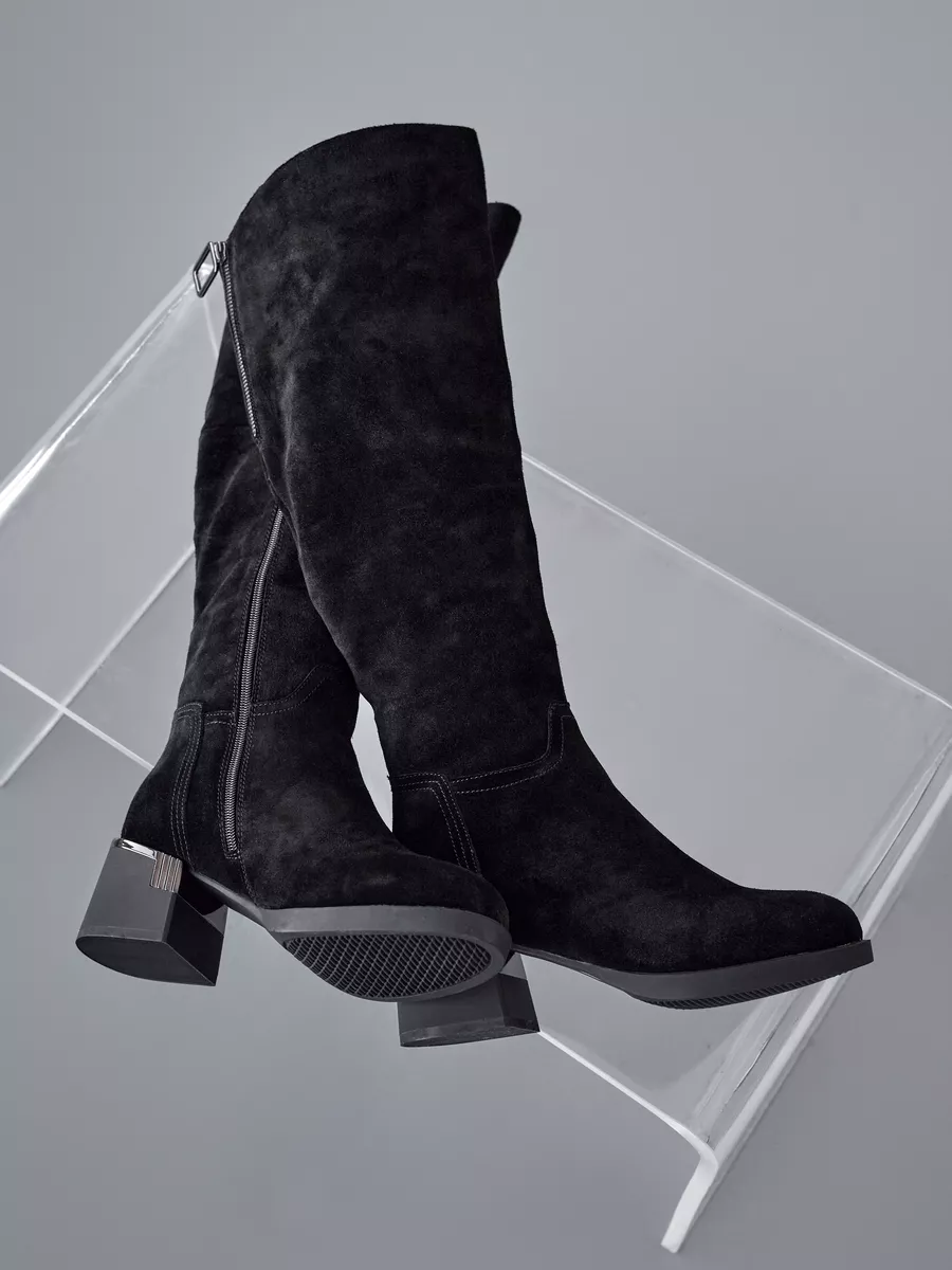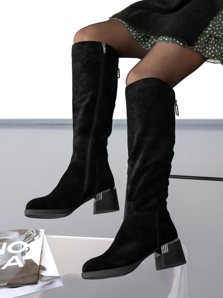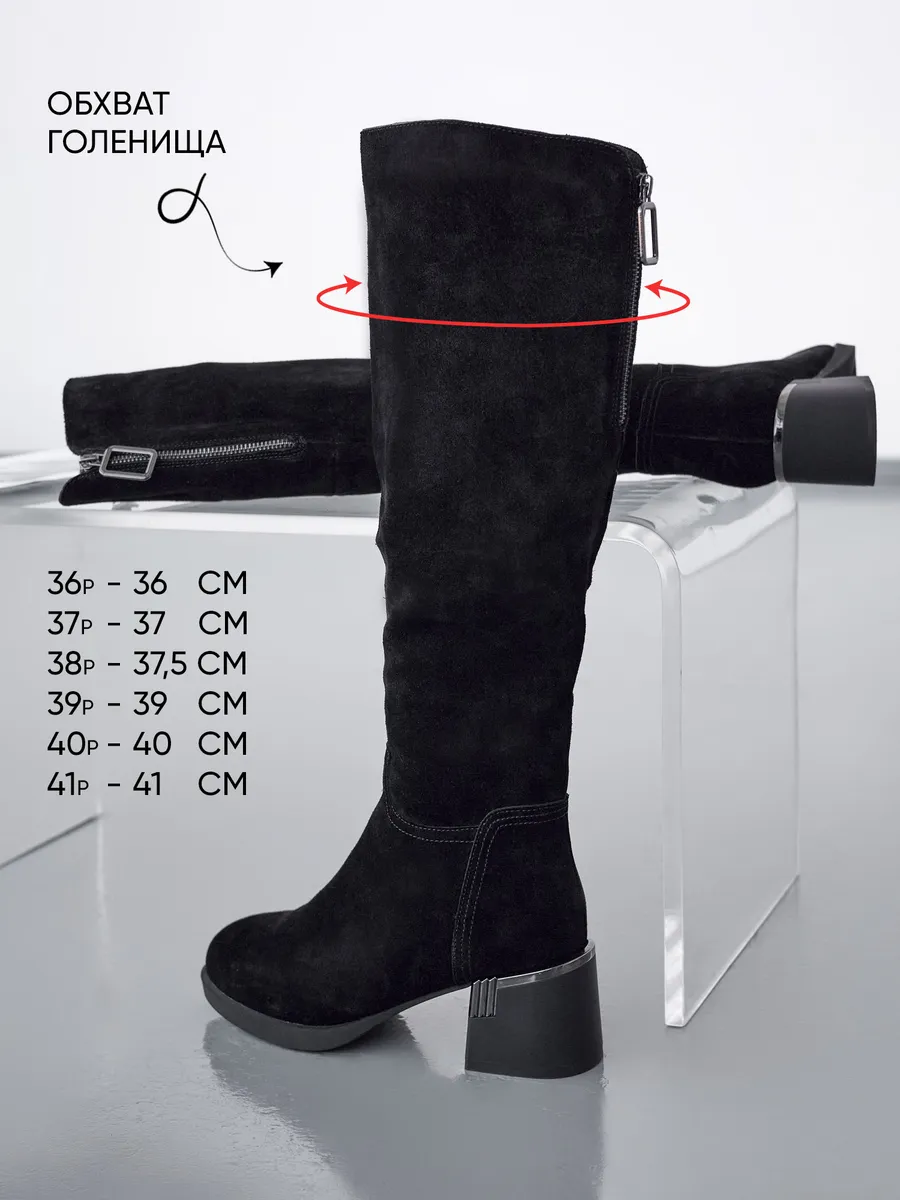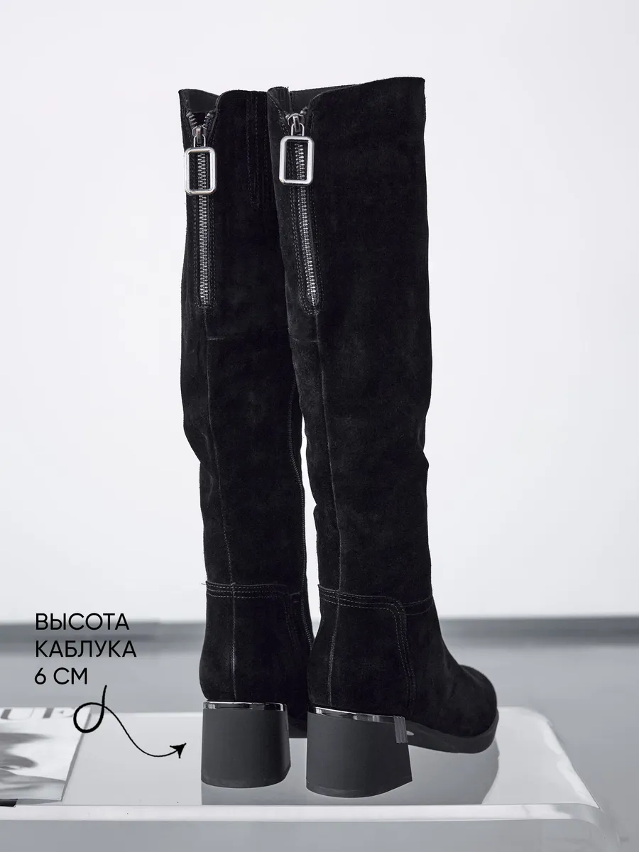 Устойчивый низкий каблук с декоративной металлической вставкой добавит элегантности любому образу. Классические черные замшевые сапоги с декоративной молнией подойдут к повседневному и праздничному наряду, оставаясь актуальными в любое время. Эти сапоги соответствуют последним модным тенденциям 2024 года, делая их стильными и современными.