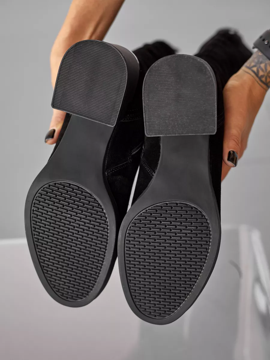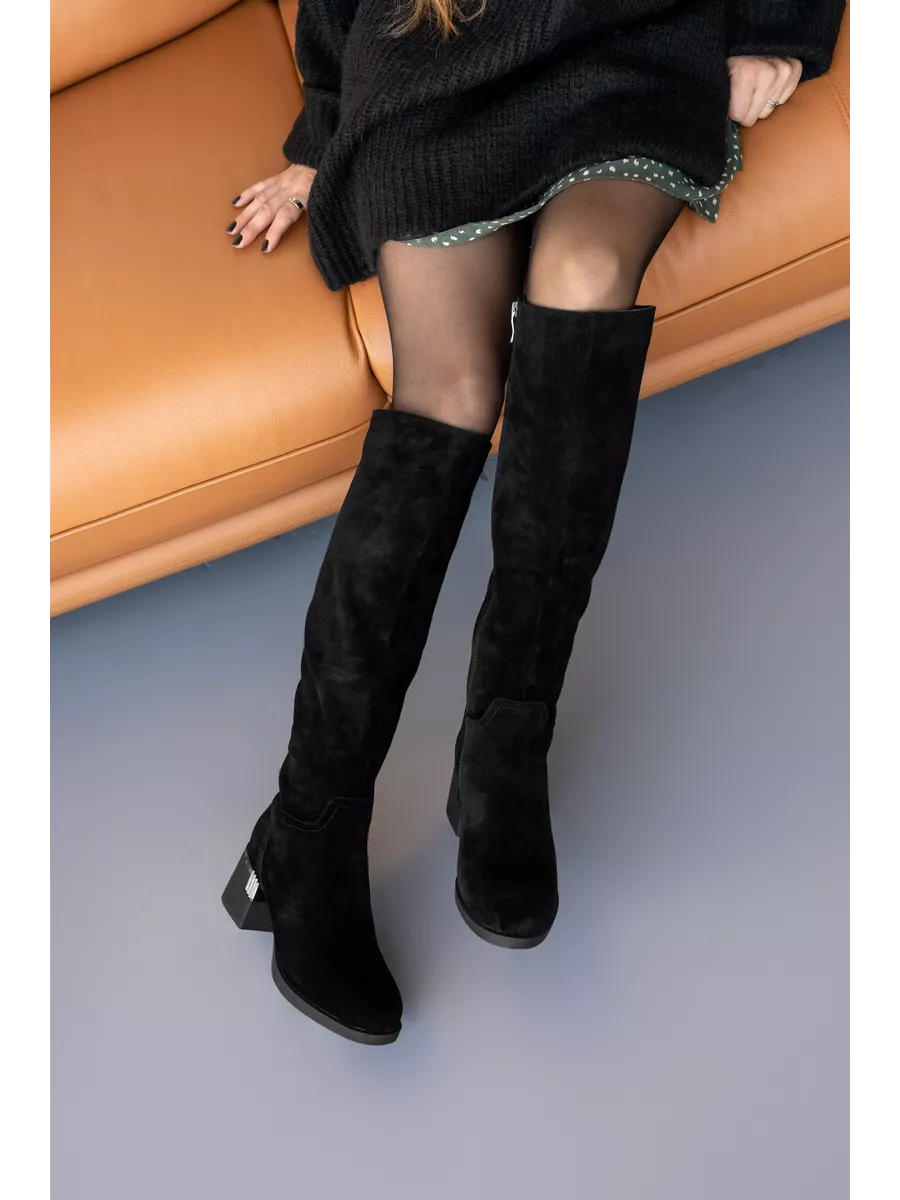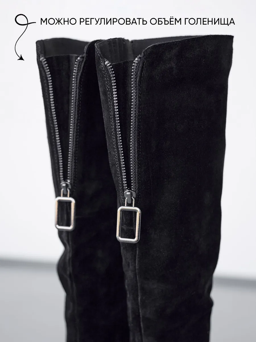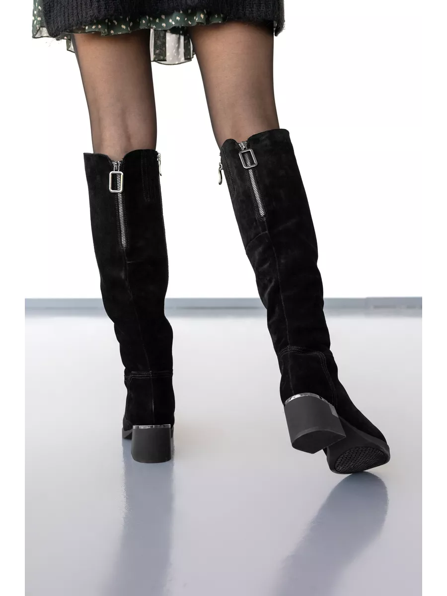 Устойчивый низкий каблук с декоративной металлической вставкой добавит элегантности любому образу. Классические черные замшевые сапоги с декоративной молнией подойдут к повседневному и праздничному наряду, оставаясь актуальными в любое время. Эти сапоги соответствуют последним модным тенденциям 2024 года, делая их стильными и современными.