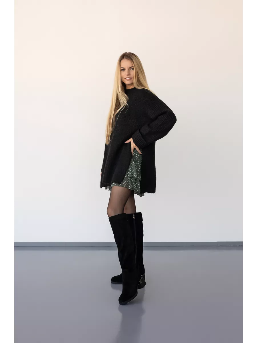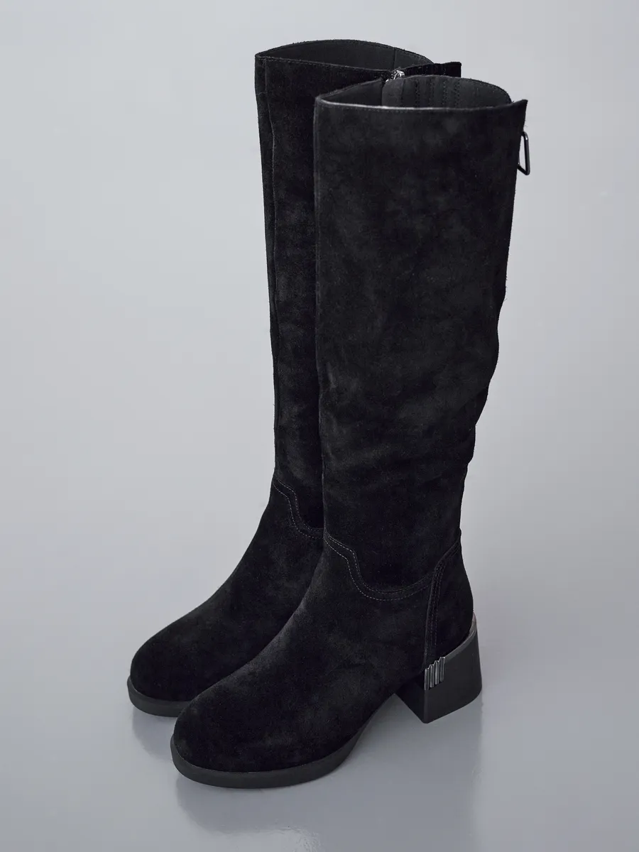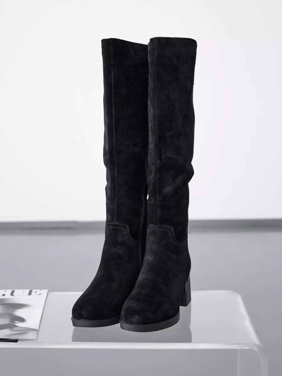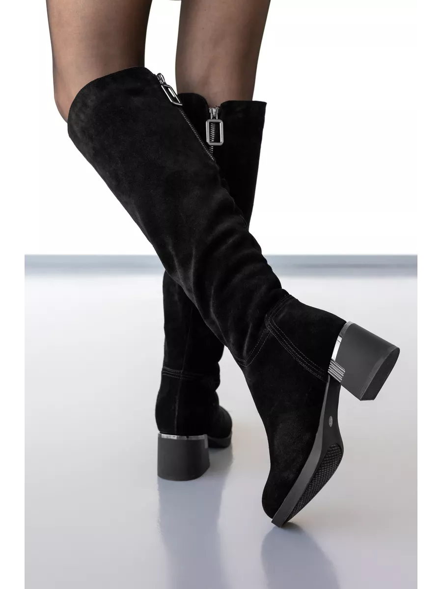 Устойчивый низкий каблук с декоративной металлической вставкой добавит элегантности любому образу. Классические черные замшевые сапоги с декоративной молнией подойдут к повседневному и праздничному наряду, оставаясь актуальными в любое время. Эти сапоги соответствуют последним модным тенденциям 2024 года, делая их стильными и современными.