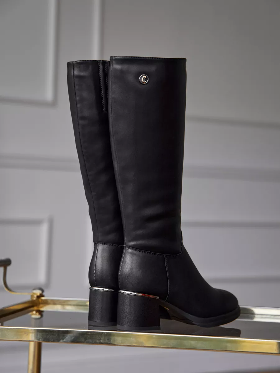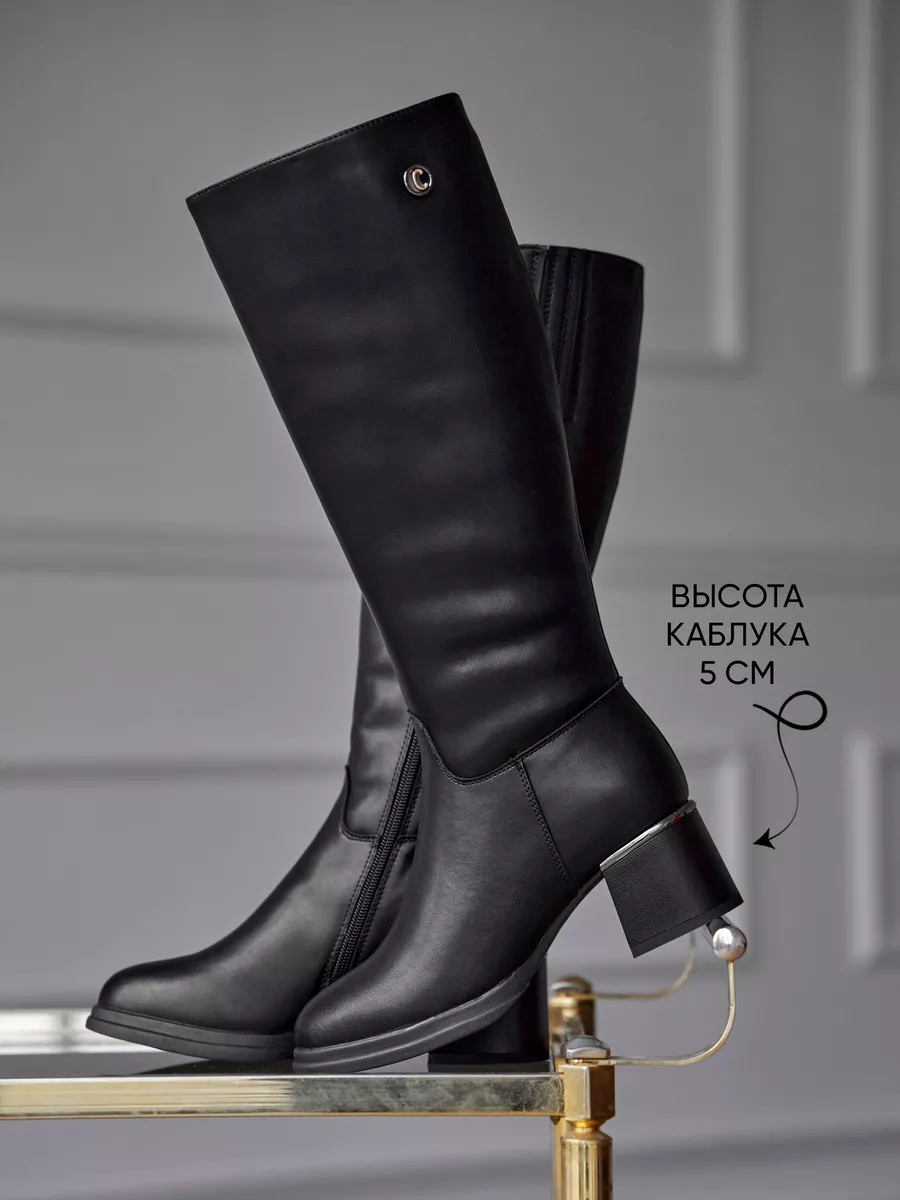 Сапожки на низком каблуке декоративной металлической вставкой гарантируют устойчивость на зимних дорогах, а удобная молния облегчает надевание и снятие. Эти сапоги - классика зимнего сезона 2024 года.