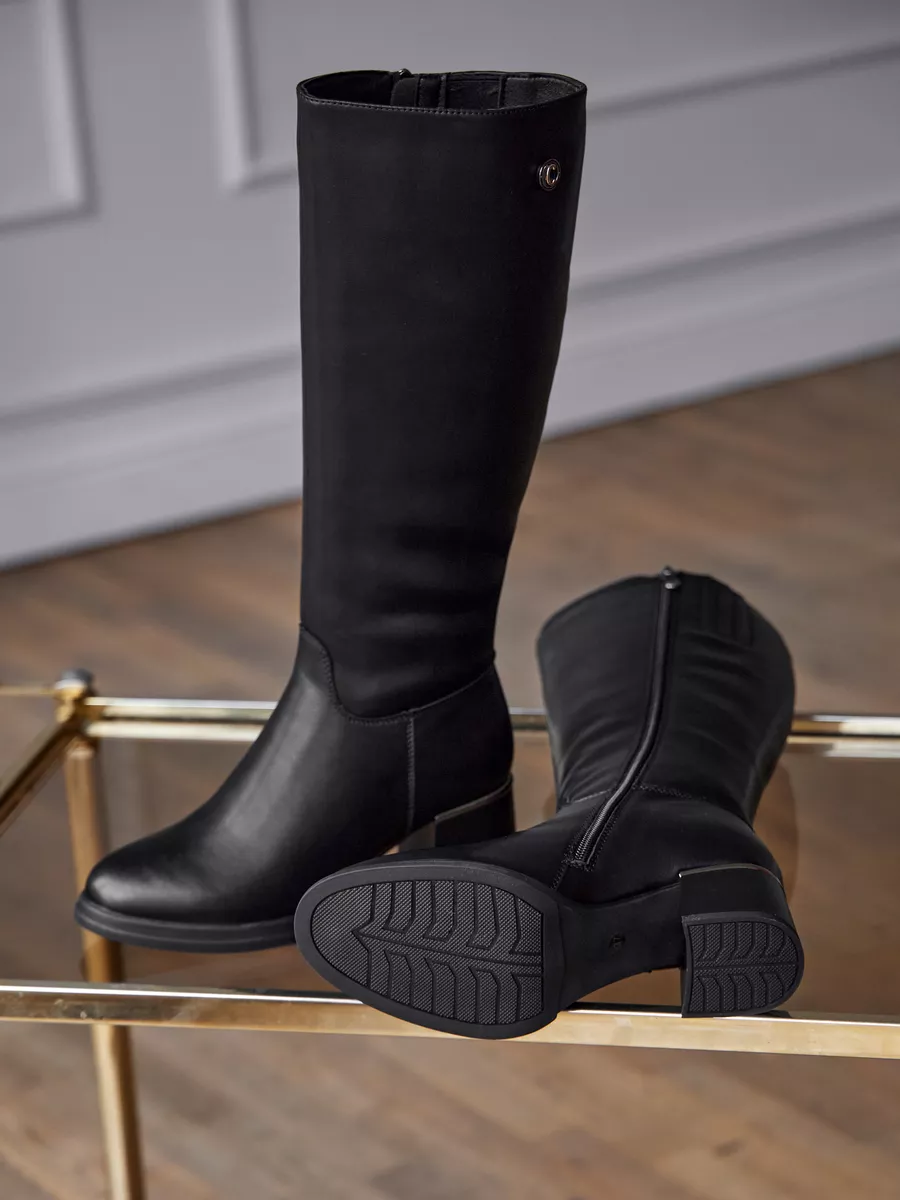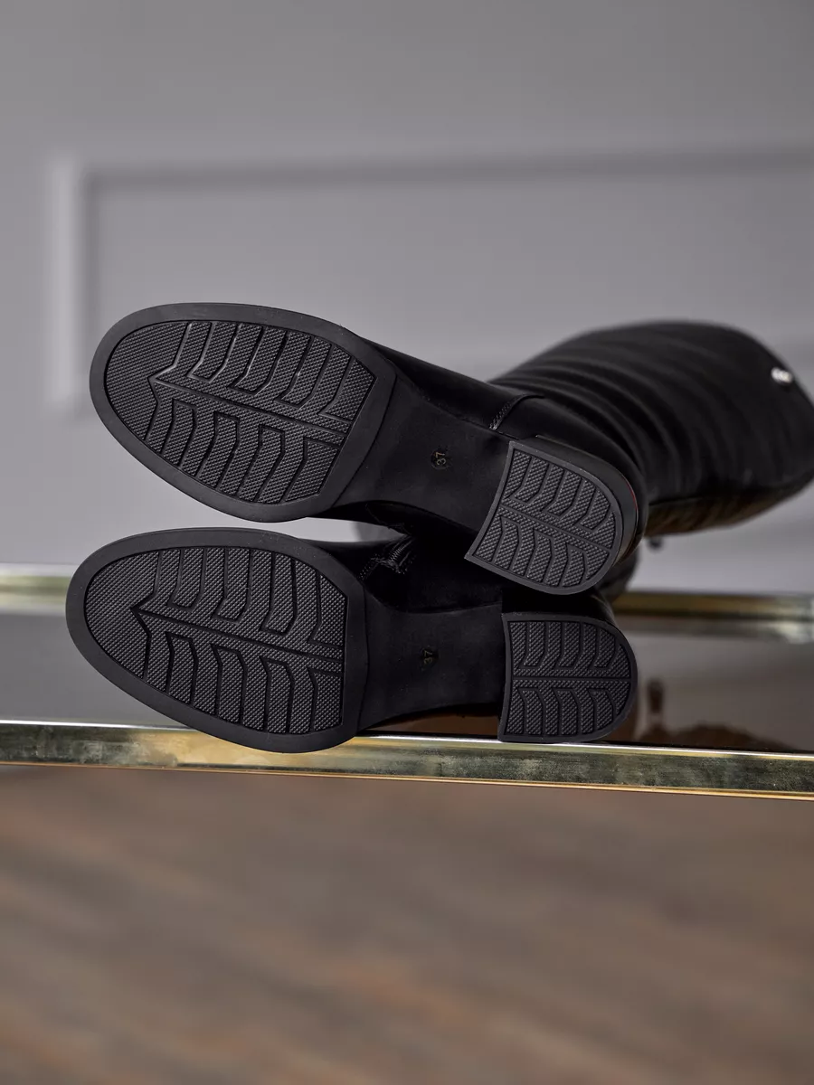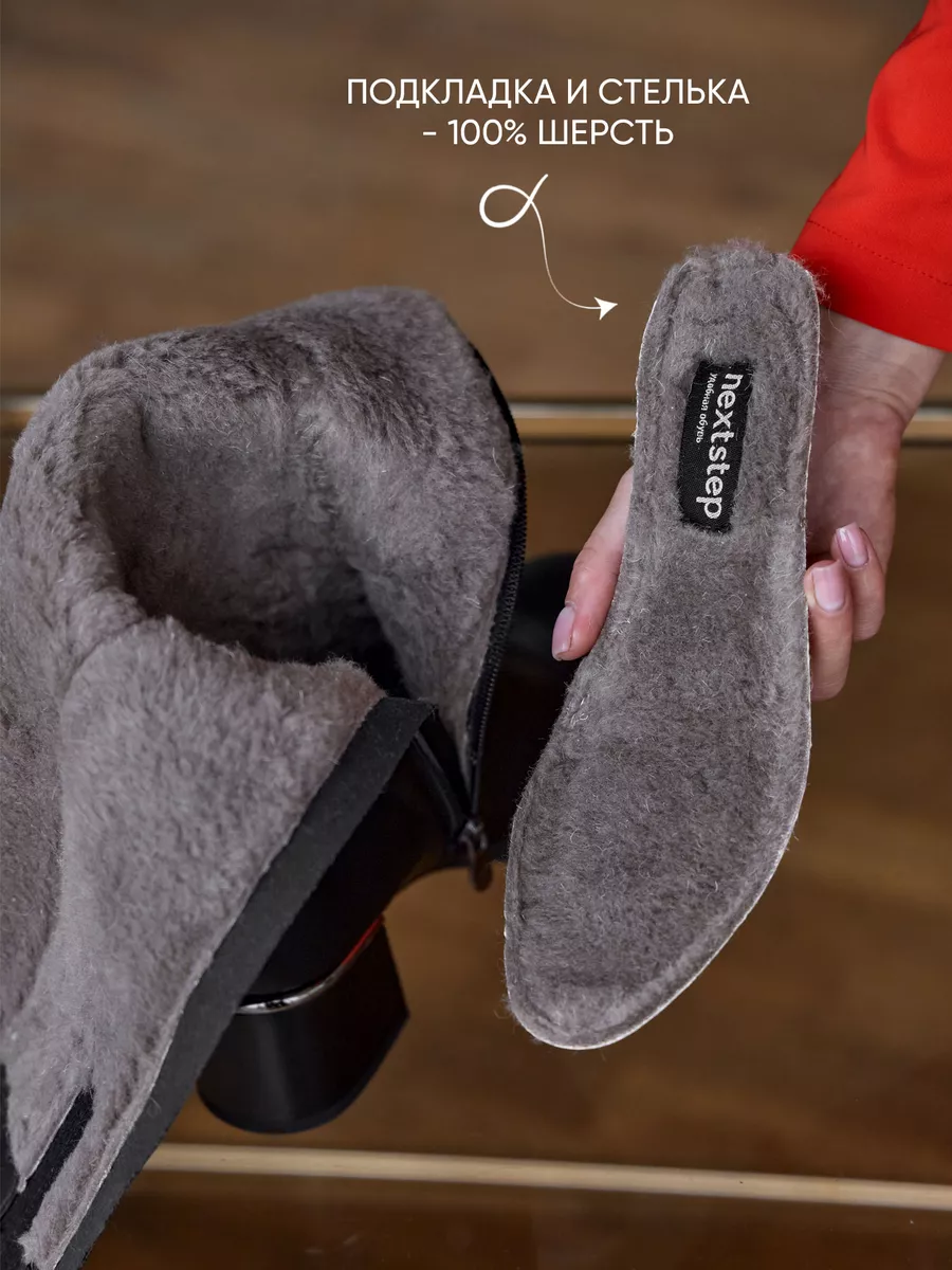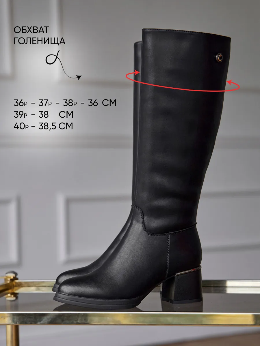 Сапоги имеют длинное голенище с брошью, которое дополнительно расширяется резинкой, что придаёт им изысканный вид. Они подойдут для проблемных стоп. Классический чёрный цвет делает их универсальными и подходящими для любого наряда — будь то повседневный или праздничный, под платье или штаны. Теплая съемная шерстяная стелька с ортопедическим эффектом и утеплённая подкладка обеспечивают комфорт и тепло даже в самые холодные дни.