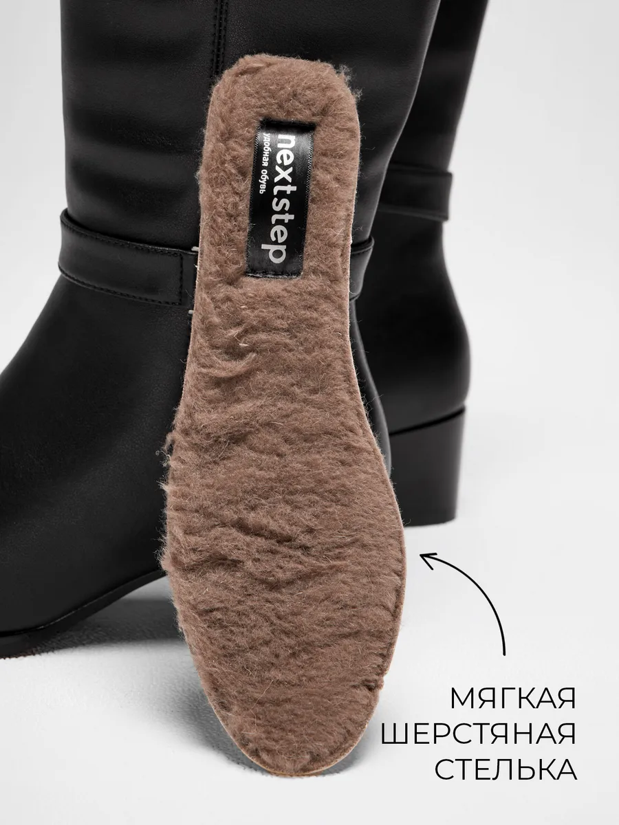 Сапоги имеют длинное голенище, что придаёт им изысканный вид. Они подойдут для проблемных стоп. Классический чёрный цвет делает их универсальными и подходящими для любого наряда — будь то повседневный или праздничный. Теплая съемная шерстяная стелька с ортопедическим эффектом и утеплённая подкладка обеспечивают комфорт и тепло даже в самые холодные дни.
